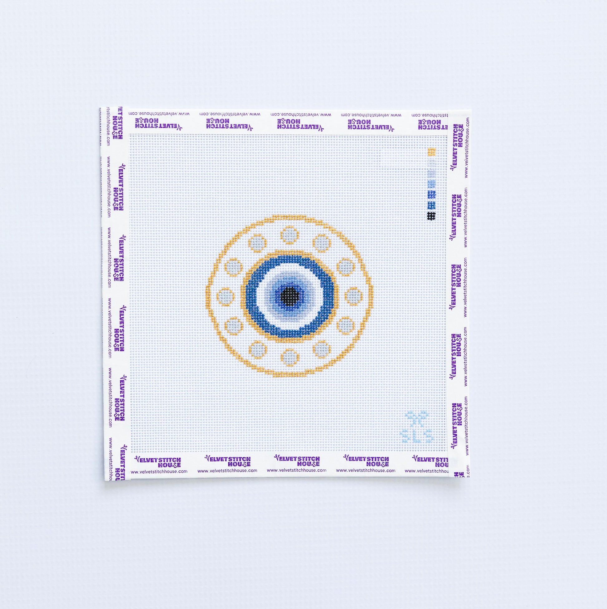 This Evil Eye design brings protective vibes with a touch of sparkle! Hand-painted on premium 18 mesh, this 3.5" circular piece shimmers with metallic golds, blues, and grays. Versatile and delightful, it works beautifully as a bag charm to keep you company on the go, a coaster, or a festive ornament to brighten your space.
